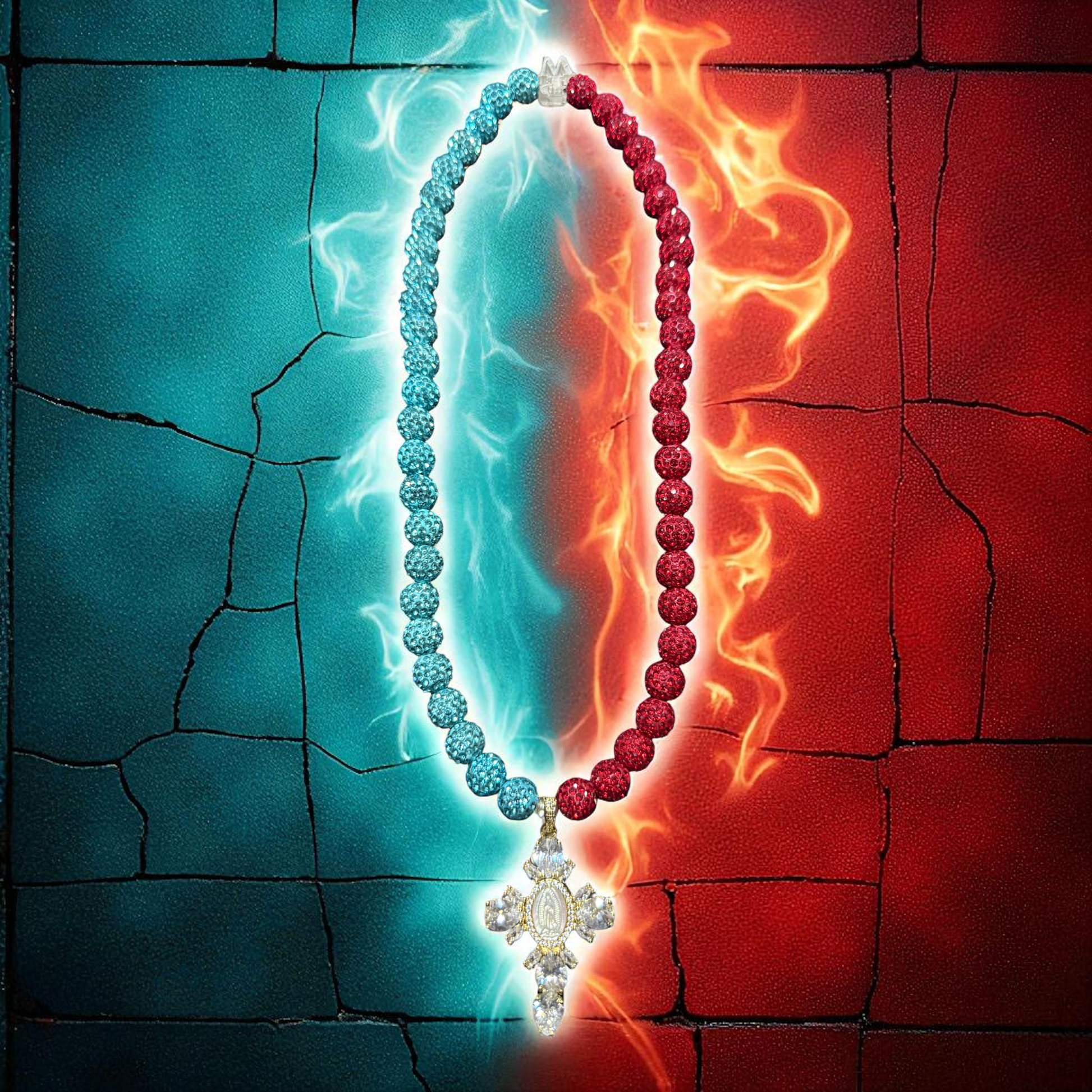 This necklace captures the clash and harmony of two worlds. The baby blue beads shine like the open sky, symbolizing purity and peace—the Angel. The red diamond beads blaze with fiery intensity, embodying strength and rebellion—the Demon. Together, they create a striking balance, making the Angel or Demon necklace a powerful piece that’s as beautiful as it is bold.